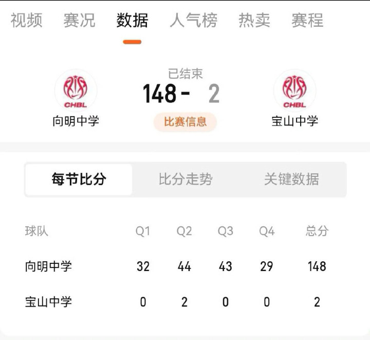 最终单节29分收尾,全场比分定格在148比2,146分的分差直接刷新了耐高上海赛区纪录,比NBA和CBA的历史最大分差还夸张。
