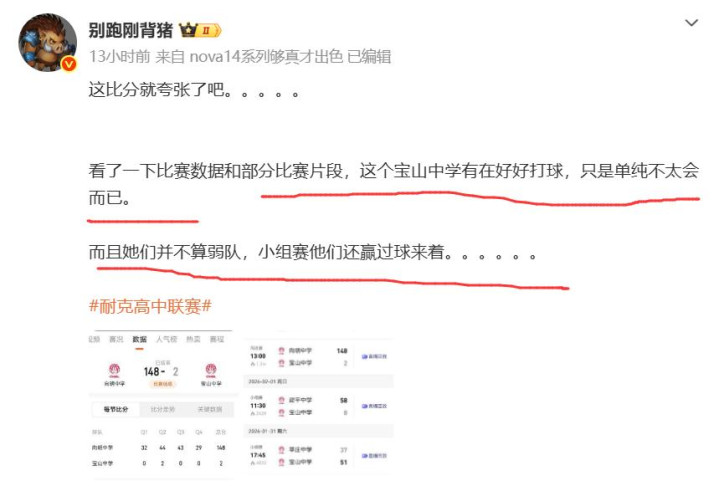 而宝山中学,据媒体人“别跑刚背猪”爆料,是第一年参加耐高,球员都是普通在校学生,很晚才接触篮球,参赛初衷就是重在参与。